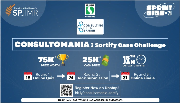 Consultomania is SPJIMR’s flagship consulting competition, hosted as part of OJASxSprint 2026, and built to replicate the rigor, pace, and ambiguity of real-world strategy consulting. Designed for students with a knack for structured thinking and problem-solving, the competition pushes participants to think like consultants from the very first round.