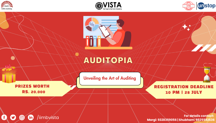 Get ready to dive into the thrilling world of auditing like never before! We are pleased to present "Auditopia" hosted by Vista 2024 in association with Audit Committee and UnStop (formerly Dare2Compete) . It will take you on an exhilarating journey through the complexities of this fascinating field. Brace yourselves for an experience that will challenge your skills, ignite your curiosity, and leave you with a deeper understanding of the pivotal role auditors play in upholding the integrity of financial statements.