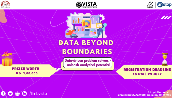 IIM Bangaloreʼs International business summit Vista 2024, in association with Analytics Club, presents Data Beyond Boundaries- an exhilarating multi-stage case competition designed for analytics enthusiasts. This competition brings together the brightest minds from diverse backgrounds to solve real-world business problems using analytics and data-driven insights.