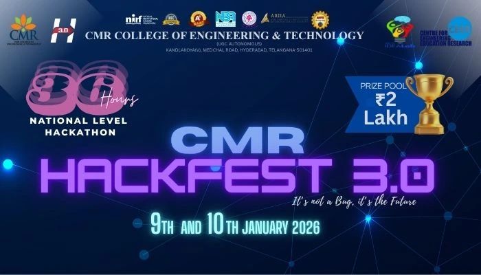 CMR College of Engineering & Technology (UGC Autonomous Institution), Hyderabad, Telangana is organizing the second edition—CMR HACKFEST 3.0 (36 Hours National Level Hackathon), which is set to take place on 09th and 10th January, 2026.